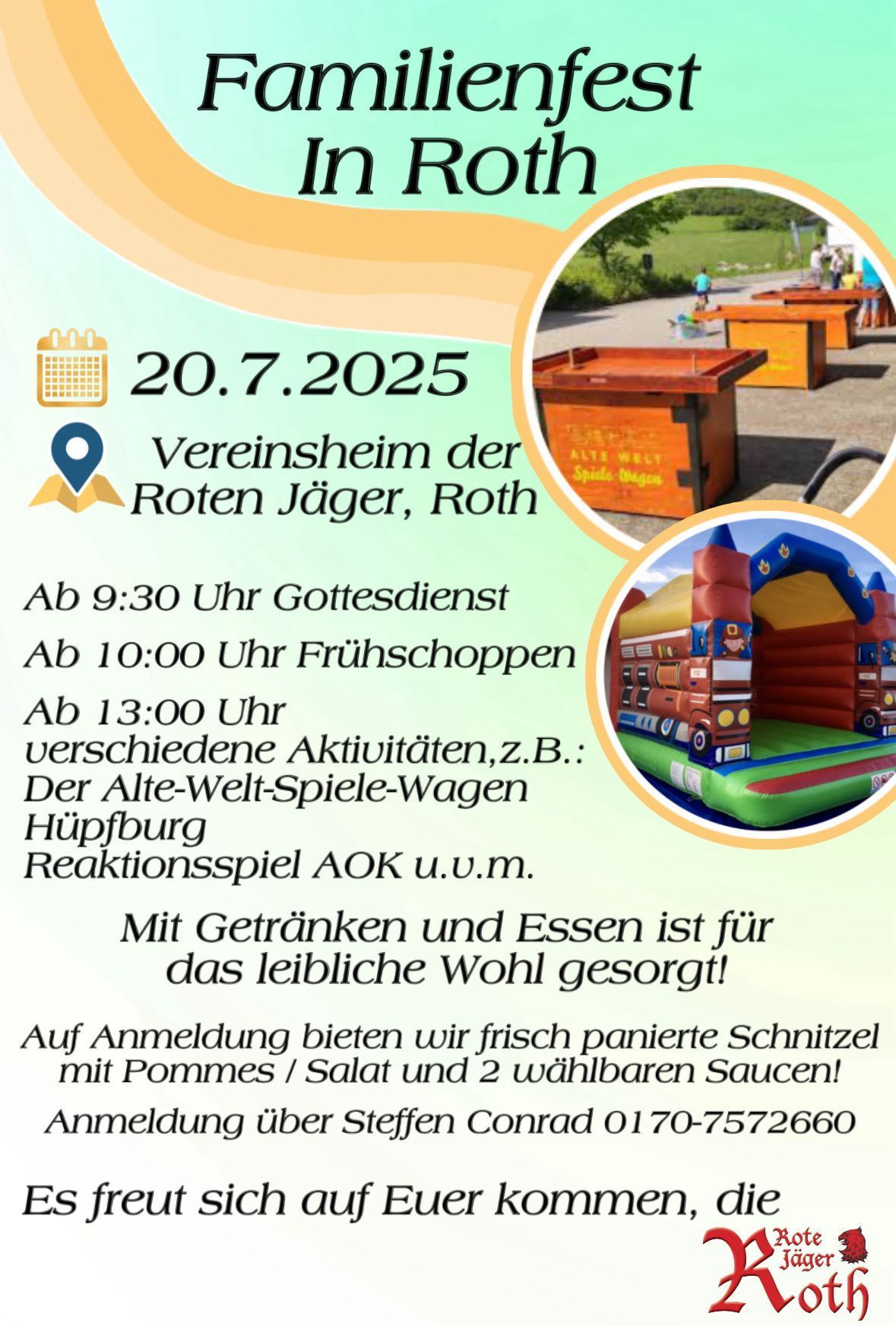 Am 20. Juli 2025 laden die Roten Jäger Roth herzlich zum großen Familienfest am Vereinsheim ein.